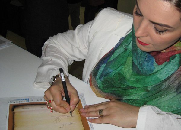 این بانوی هنرمند در مراسم افتتاح نمایشگاه آثارش دست خطی را به موزه مجازی و دفتر یادبود پایگاه اطلاع رسانی جاویدالاثر عباس کهن اهدا کرد با این ابیات: